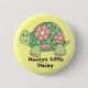 Uma tartaruga pequena bonito com margaridas cor-de-rosa trabalhou nos azulejos do escudo. Este botão da tartaruga pode ser fixado em jaquetas, em trouxas, em chapéus, etc. Um presente doce para que um pai dê sua filha para seu aniversário, ou no primeiro dia da escola, ou apenas porque é a menina de um pai.