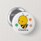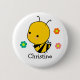 Botão de crachá fofo com uma abelha amarela e preta e três lindas flores com um modelo abaixo para adicionar seu nome para personalizar.