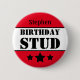 Crachá divertido para o garanhão de aniversário. O fundo é vermelho com uma faixa branca ao longo do meio, com bordas pretas. Dentro a faixa branca são as palavras Aniversário Estudo em letras negras. Abaixo da área vermelha inferior estão três estrelas pretas. Uma modelo para adicionar o nome dos aniversários no topo do crachá.