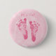 Um botão do anúncio do nascimento do bebé com pegadas cor-de-rosa bonitos contra um fundo cor-de-rosa feminino macio. Personalize adicionando o nome do seu bebé ao texto customizável que diz: É uma menina. Aperfeiçoe para um chá de fraldas.
