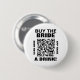 Botão de código QR digitalizável de festa de solteira em branco e preto com a mensagem "comprar a noiva de uma bebida" e o nome do aplicativo.
