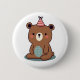 Um desenho animado adorável, fofo, feliz de um ursinho de pelúcia castanho vestindo um chapéu de festinha vermelho e creme riscado. Ele tem um sorriso e bochechas rosadas e uma mancha azul e branca com estampas na barriga.
