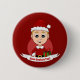 Botão redondo com uma ilustração de um lindo e sorridente rapaz loiro, ele está vestindo fantasia de Papai Noel vermelho e branco e segurando um presente; com um modelo de texto editável para seu nome ou mensagem, design de feriados de Natal com fundo vermelho