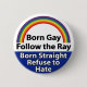 O BOTÃO DO ORGULHO GAY PROJETADO POR DEVIN MICHAEL QUE CONTEM CORES DO ORGULHO, E O GAY NASCIDO SEGUEM A RECUSA RETA NASCIDA DO RAIO PARA DIAR A FRASE.