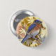 Desenho de linha e aquarela de um pássaro azul empoleirado numa pose contemplativa sobre um fundo foliar em tons dourados e azuis.