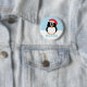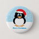 Espalhe alguns elogios e sorrisos do Natal quando você veste este botão bonito do pinguim do Feliz Natal. Caracteriza um pinguim dos desenhos animados que veste um chapéu de Papai Noel contra um fundo do floco de neve. Um botão do Natal do divertimento para miúdos de todas as idades ou dá-as para fora para presentes de época natalícia.