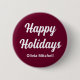 Botão de vinho tinto escuro e escuro sólido da nossa "Coleção de Cores de Natal Tendy Pink". Este botão elegante é a maneira perfeita de adicionar um toque de alegria festiva à sua roupa de férias. O texto "Feriados Felizes" é personalizável e o nome também pode ser personalizado.