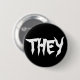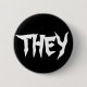 Botão preto de fundo redondo com a palavra "THEY" em todos os bonés em uma fonte que é um estilo semelhante ao que as bandas de metal usam em seus cobrir de álbuns.