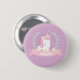 Um crachá do botão para o pouco um personalizado com seu nome. Caracteriza um unicórnio branco pequeno bonito com sparkles mágicos em torno de seu chifre. Flores e grinalda como elementos decorativos.