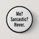 Botão Engraçado com um meme "Eu? Sarcástico? Nunca." Preto & Branco. O melhor presente para um amigo sarcástico.