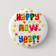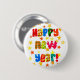 Um Botão ou Crachá de Ano Novo com 'Feliz ano novo' em letras multicoloridas e laranja e amarelo começa espalhado por todo o fundo branco. De um design de colagem de papel pintado à mão por Judy Adamson.