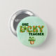 Este botão Um Professor Sortudo está sobre um fundo aquoso verde e tem um padrão de bolinhas verde e laranja para as letras de Lucky. Há uma pedra de champanhe para o "U" e um pote de camarões também.