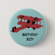 Botão vermelho do pino do menino do aniversário do biplano que caracteriza o avião vermelho do vintage na cor customizável do fundo com área editável para o texto