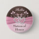 Este botão personalizado de Dama de Honra floral rosa e marrom com uma fita rosa IMPRESSA e um broche de corações unidos com brilho FAUX IMPRESSO e jóia de diamante combina com o convite de casamento mostrado abaixo. O texto é personalizável e também o é a forma e o tamanho do botão. ****POR FAVOR, note que se você mudar a forma, o texto pode ser cortado. Ele será impresso como aparece no seu monitor, e você deve permitir espaço adequado em torno das bordas, então NÃO coloque o texto até a borda. Se você precisar que algo seja alterado, por favor, envie um email para niteowlstudio@gmail.com.