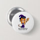 Um botão com uma bruxa bonita vestindo um chapéu de bruxa roxa. Seu gato preto descansando em cima da cabeça. Ela tem cabelo laranja longo e é carregando vassoura. Ótima ilustração de desenho animado perfeita para halloween.
