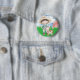 Button mit einem Jungen mit seinem kleinen Kalb auf einer Wiese mit einer roten Scheune im Hintergrund.