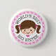 Botão bonito/pino do pinback que caracteriza uma menina pequena dos desenhos animados com o cabelo marrom amarrado acima nas tranças com arcos cor-de-rosa. Texto do "a melhor irmã mais velha mundo". Em torno é uma beira redonda, cor-de-rosa com bolinhas. Também disponível em uma versão para irmãs mais nova.