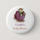 Botão personalizável para seu chá de menina com uma ilustração de um dinossauro bebê eclodindo de seu ovo. Ilustrada e projetada por Patricia Alvarez.