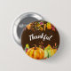 Um botão com o texto: Obrigado. Projetado com uma ilustração aquosa de abóboras, boletas, cogumelos e folhas sazonais de outono. Uma fronteira ao longo do topo também composta por folhas de outono, bagas, bolotas e outras folhagem. Fundo castanho escuro.