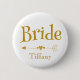 Celebre a noiva com este botão personalizado elegante! Com a palavra "Noiva" em uma fonte dourada graciosa e uma seta adornada com corações, este crachá personalizado inclui o nome da noiva em uma fonte correspondente abaixo. Perfeito para chás de panela, festas de solteira, celebrações de noivado ou o grande dia, este botão encantador adiciona um toque de elegância personalizada a qualquer ocasião de casamento.