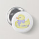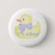 Um pato amarelo com uma fita azul e um texto azul que a leia "é um menino!" em botões, em ímãs, e em mais do bebé.