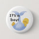 Um bebé adorável em uma cobertura azul e o miúdo denominam o texto que a lê "é um menino!" em botões e em ímãs do anúncio do bebê.