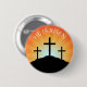 Botão de pintura da páscoa / pino / crachá com três cruzes como silhuetas contra o fundo do sol. Texto "Ele está levantado".