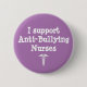 Ajude a parar o assédio moral na saúde vestindo este botão de Enfermeiro Anti-bullying Enfermeiro Roxo. O assédio entre enfermeiras é real e está acontecendo todos os dias. Estamos perdendo cada vez mais enfermeiros por causa do apagão precoce. Fale se você testemunhar algum assédio no trabalho. O botão é projetado com um fundo roxo de lavanda personalizável e letras brancas em negrito. O texto é "Eu apoio enfermeiras antibullying" com um símbolo médico caducioso branco.