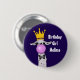 Botão de menina de aniversário com uma lama branca soprando uma grande bolha rosa. Vestindo uma coroa dourada e uma gravata arco preta. Fundo roxo escuro.