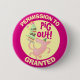 Um porco feliz num botão ou crachá de aniversário. Use "Personalizar este modelo" para ajustar o texto "PERMISSÃO PARA FAZER PIG OUT CONCEDIDO" e criar um item exclusivo e personalizado. Apresentando um porco glorioso, debaixo de um bolo de camada de raspagem com pisos de gelo verde e cortado com velas cor-de-rosa.