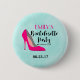 Um botão com uma imagem digital de um calçado de salto alto, em rosa quente. Fundo verde de cor d'água. Festa de solteira escrita em uma fonte de tendência fofa. Chic e design moderna. Personalize com seus detalhes de festa de solteira.