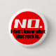 Este pino do botão do flair apresenta um logotipo vermelho com o texto "Não. Não sei o que é aquela rocha." Para aqueles que recebem pedidos demais para dar nomes a rochas misteriosas.