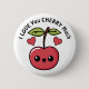 Crachá adorável, pinheiro, com um desenho animado fofo, cereja vermelha feliz kawaii com o sorriso mais doce, olhos redondos grandes e folhas verdes em um caule marrom. Dois pequenos corações vermelhos estão flutuando no topo da cereja. Em uma fonte preta divertida curvada sobre a cereja estão as palavras' I Love You Cherry Much'. Esta é uma modelo que você pode deixar como está ou substituir as palavras pelo seu próprio texto.