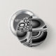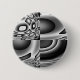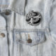 Este botão apresenta um padrão preto e branco que pode se parecer com muitas formas e formas, mas toda a imagem se parece com uma mau com olhos escuros encarados e um sorriso largo.