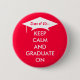 Um pino vermelho sobre o botão com um boné impresso e espaço para o ano de graduação no topo e as palavras "MANTER CALM AND FORMANDO ON".
