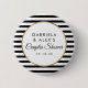 Com um clássico fundo de listras pretas e brancas, estes botões elegantes de chá de noiva de casais apresentam uma borda de folha dourada falsa elegante emoldurando sua mensagem de casamento personalizada especial em tipografia chic. Projetado por Thisisnotme©