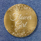 Um botão de vidro feminino para a florista na sua festa de casamento. Todo o texto elegante do estilo caligrafia moderno é personalizável. O plano de fundo apresenta uma folha de ouro falsa com brilho falso brilhante. Estes elementos digitais são impressão como uma foto.
