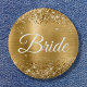 Um botão de vidro feminino para a noiva na festa de solteira ou chá de panela. Todo o texto elegante do estilo caligrafia moderno é personalizável. O plano de fundo apresenta uma folha de ouro falsa com brilho falso brilhante. Estes elementos digitais são impressão como uma foto.