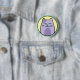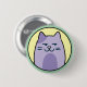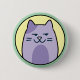 Cute round button/pin of a purple cartoon cat giving a side eye on a yellow and green background.