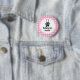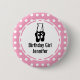 Botão de menina de aniversário com uma ilustração negra de sapatilhas de dançarinas de balé e suas pernas. Ballerina está de pé nos dedos dos pés, em ponto. Fundo é um padrão feito de bolinhas brancas em rosa.