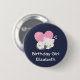 Botão de menina de aniversário com uma ilustração gráfica adorável. Uma gatinha branca com uma bela imagem impressa no pelo. Dormindo em paz. Um grande coração rosa atrás dela e algumas estrelas pequenas também. Fundo azul escuro.