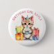 Botão personalizado adorável de aniversariante com uma ilustração fofa de água do ai de um gatinho com chapéu de aniversário e presentes.