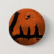 Um botão do tema super divertido do Dia das Bruxas. Gatinhos de bruxas sentados em uma árvore observando como um gatinho de bruxas voando. Um design de Halloween divertido e caprichoso.