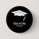 A white graduate's cap is above the text to show the year the student is graduating and school name. White text appears on this black graduation button.