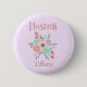 Um botão de excelente para a hospedeira do chá de panela, este design apresenta um lindo fundo lilático com "Hostess" escrito no topo com uma fonte rosa e divertida. Embaixo está um buquê de flores rosa e azul com seu nome personalizado no fundo. Faça seu pedido hoje mesmo!