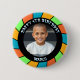 Botão Birthday Boy. Feliz Aniversário para você, adicione nome, idade e foto a este botão personalizado de aniversário. Fundo preto, laranja, azul e verde da pop.
