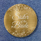 Um botão de vidro feminino para a irmã da noiva. Todo o texto elegante do estilo caligrafia moderno é personalizável. O plano de fundo apresenta uma folha de ouro falsa com brilho falso brilhante. Estes elementos digitais são impressão como uma foto.