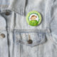 Botão com uma ilustração de desenho animado de um macaquinho saindo de trás de um arbusto verde. Cercada por uma coroa de folhas tropicais. Colocado sobre um fundo de aquarela verde-oliva.
