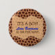 Este botão mostra um fundo de impressão de girafa junto com o texto "É um menino! [Nome do Bebê] está a caminho!" Este é um excelente para girafa temática, tema animal, tema safari, tema zoológico ou chás de fraldas temáticos da selva.
