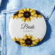 Botões de casamento Sunflower Bride com girassóis amarelos em aquarela floral e texto personalizado em fundo branco. Você pode usar isto para chá de noiva, jantar de ensaio, chá de casal, noivado e recepção. Use a opção personalizar este modelo para alterar o texto | Use a opção personalizar ainda mais para alterar o estilo e a cor do texto, se necessário. Este produto faz parte de uma coleção; portanto, verifique nossa coleção da loja para itens correspondentes.